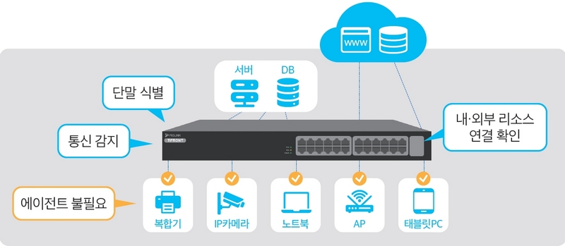 ์ค์์น ๊ธฐ๋ฐ์ผ๋ก ์๋ํ๊ธฐ ๋๋ฌธ์ ์์ด์ ํธ์ ์๊ด ์์ด ๋คํธ์ํฌ ํต์ ์์ฒด๋ฅผ ๊ฐ์ํ๊ณ , ์ ๊ทผ ํต์ ํฉ๋๋ค. ์์ด์ ํธ ์ค์น๊ฐ ๋ถ๊ฐ๋ฅํ ๋ชจ๋ ๊ธฐ๊ธฐ(IoT/OT ๊ธฐ๊ธฐ, ํน์ ์๋ฒ ๋ฑ) ๋ฐ ๋ฌด์ AP์ ์ฐ๊ฒฐ๋ ๋จ๋ง๊น์ง ์๋ฒฝํ๊ฒ ๋ณดํธํฉ๋๋ค.
