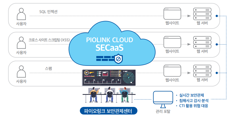 파이오링크 SECaSS는 강력한 웹방화벽(WAF)과 보안 전문가의 24시간 관제를 하나로 합친 구독형 보안 서비스입니다. 웹방화벽이 탐지한 위협을 보안 전문가가 실시간으로 분석해 오탐을 걸러내며, 위협에 즉각 대응이 가능합니다. 자동화된 방어(웹방화벽)에 인간의 판단 및 분석력(보안관제)이 더해져, 그 어떤 위협과 공격도 빠져나갈 틈이 없습니다🤝