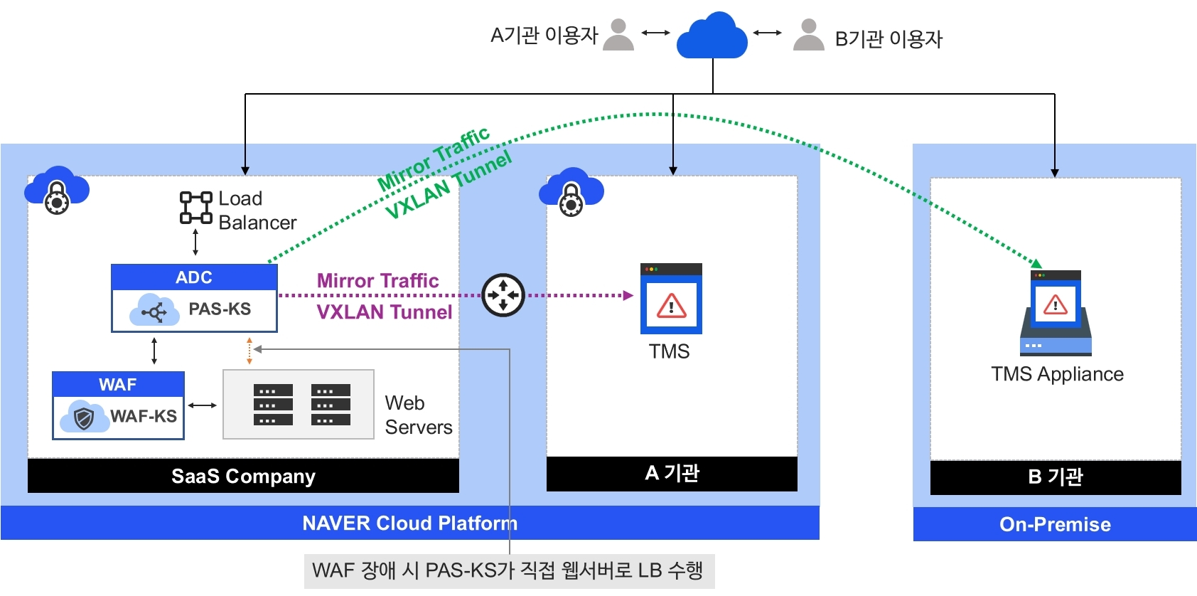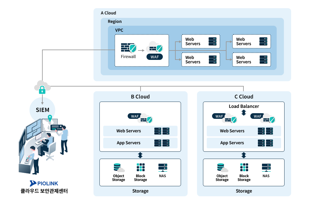 클라우드 환경에서는 보안 장비 간 물리적인 연결이 불가능해, 온프레미스 방식으로 트래픽을 제어하기 어렵습니다. 파이오링크는이러한 어려움을 해결하기 위해 클라우드 로드밸런싱(L4/L7스위칭) 플랫폼을 활용합니다. WAF, IPS, IDS 등 여러 보안 솔루션을 유기적으로 연결해 트래픽 흐름을 안전하고 효율적으로 관리합니다.