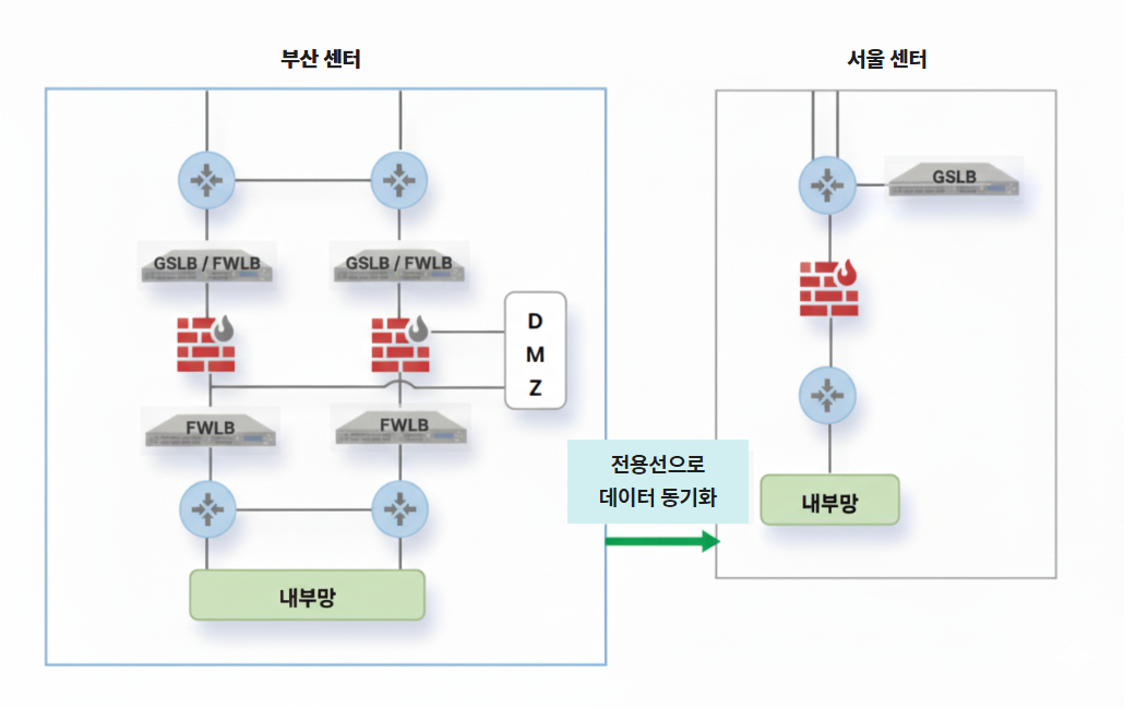 ์ด๋ฌํ ์ํ์ ์ต์ํํ๊ธฐ ์ํด ๋ถ์ฐ ๋ณธ์ฌ ๋ฐ์ดํฐ์ผํฐ์ ์์ธ DR ์ผํฐ ๊ฐ Hot Standby ๊ธฐ๋ฐ ActiveโStandby ์ด์ํ ํ๊ฒฝ์ ๊ตฌ์ถํ๊ณ , ์ธํ๋ผ ์ต์๋จ์์ ์ ์ ๋๋ ํธ๋ํฝ์ ์์ ์ ์ผ๋ก ๋ถํ ๋ถ์ฐํ๋ฉฐ GSLB ์๋น์ค๋ฅผ ์ํํ ๊ณ ์ฑ๋ฅ L4 ์ค์์น ๋์ ์ด ํ์ํ์ต๋๋ค.